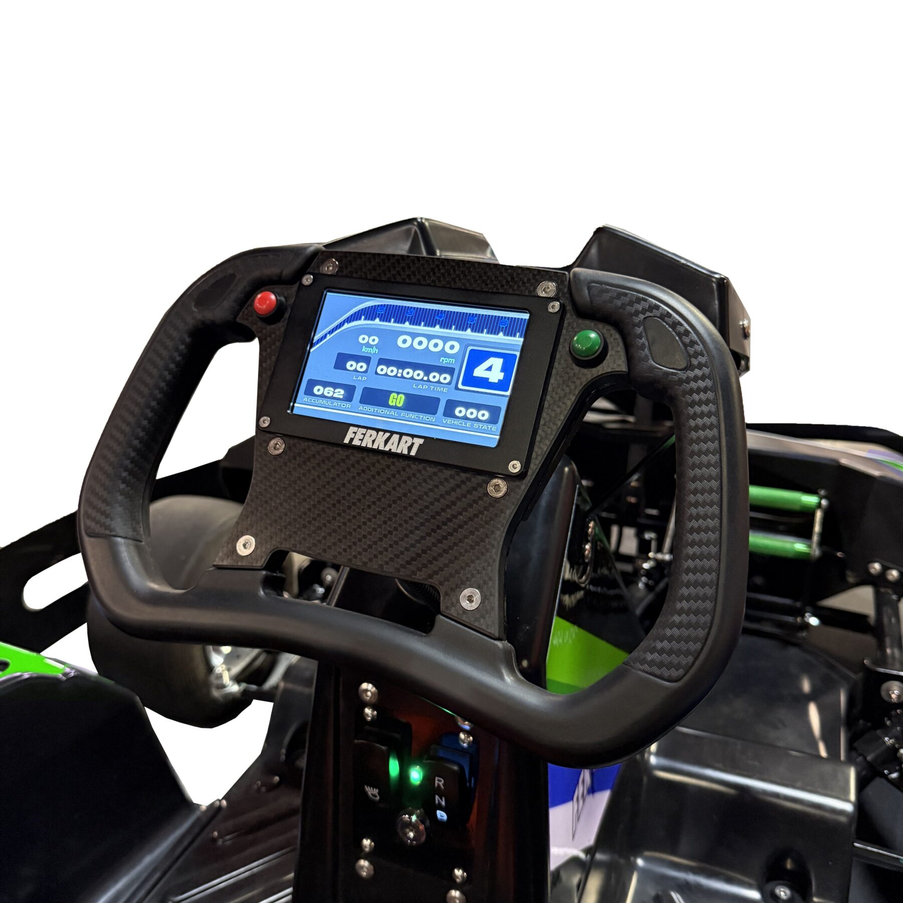 High tech F1-style steering wheel with integrated LCD display showing real time speed, lap timing, battery status, and diagnostics for fast troubleshooting.